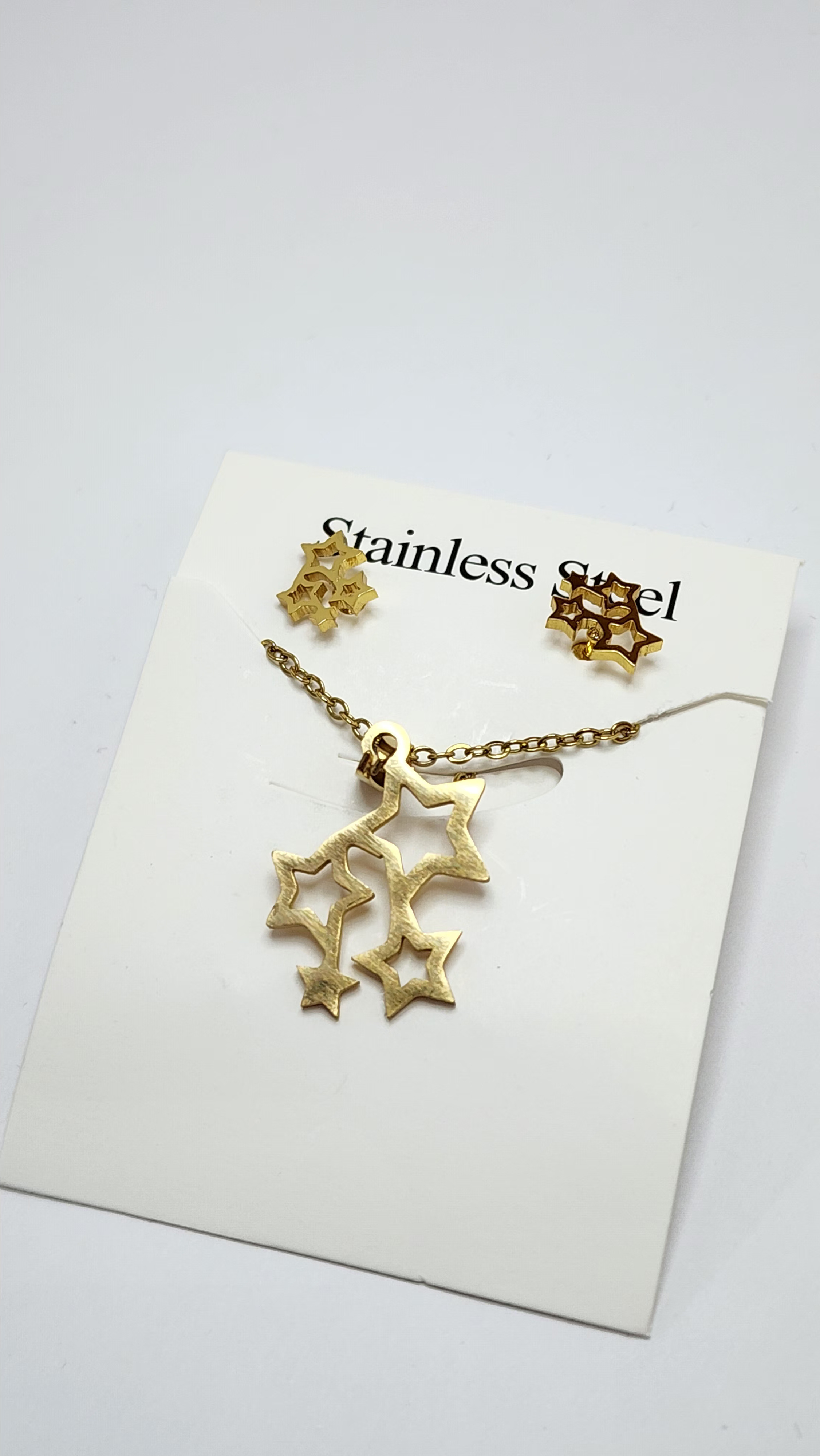 - مجموعه کامل: شامل یک گردنبند با آویز ستاره شیک و یک جفت گوشواره میخی ستارهای هماهنگ، برای ایجاد یک ظاهر منسجم و چشمنواز.