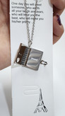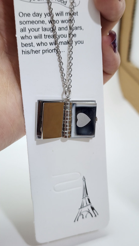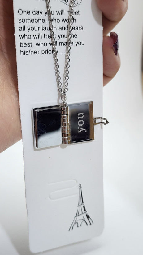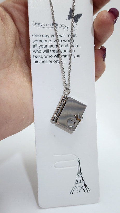 - طراحی: به شکل یک کتابچه مینیاتوری طراحی شده که به صورت افقی باز میشود و سه ورق دارد. این طراحی خلاقانه، حس نوستالژیک و رمانتیکی به گردنبند میبخشد.