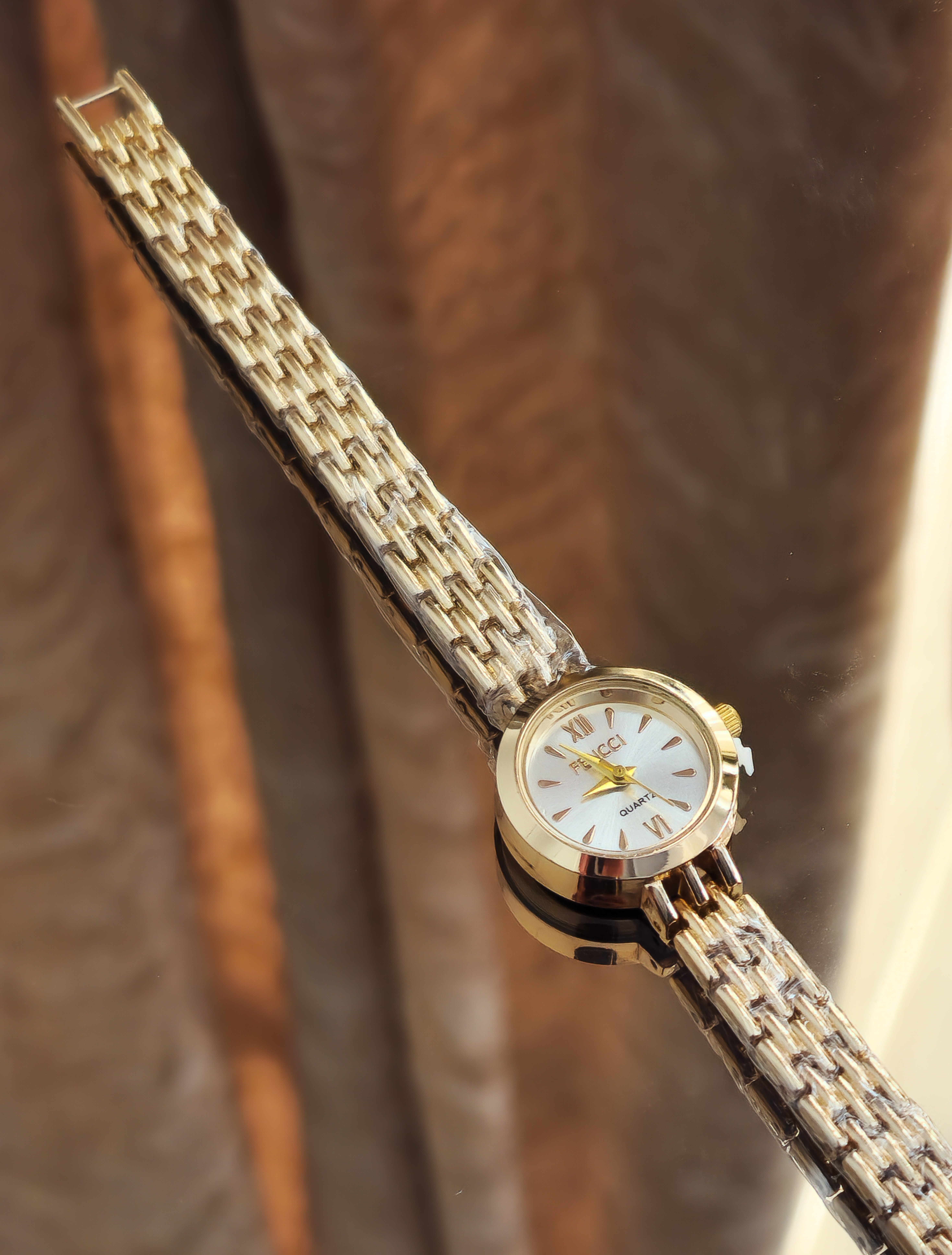 ساعت مچی زنانه با طراحی شیک و بند تمامطلایی با بافت ظریف، مناسب استایلهای مجلسی و روزمره. قاب براق طلایی، صفحه سفید با اعداد رومی و موتور دقیق، ظاهری لوکس و دخترانه به این ساعت میبخشد.